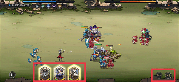3、游戏开启时,你既能够随意点击可参战的英雄卡牌展开战斗,也能点击右下角的“auto”自动发起战斗。