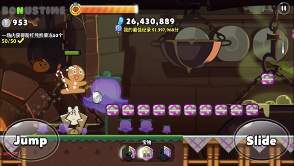 在《跑跑姜饼人》游戏里,玩家需操控萌趣的姜饼人,凭借奔跑、跳跃、滑行等动作努力向前。在躲避障碍物的同时,收集果冻、金币与宝箱。当吃到带有字母的果冻,玩家便能进入BOUNSTIME奖励环节,从中可获取大量金币。不仅如此,在跑酷过程中,玩家还能拾取途中出现的各类道具,像加速道具、变身道具、磁力石等,以此助力自己跑得更远、坚持更久。