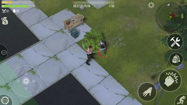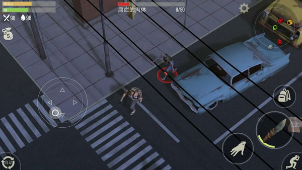 1、新手在进入游戏中需要控制屏幕左侧的摇杆来控制角色移动,在屏幕的右下角正中间的拳头图标是攻击按键,点击可以攻击僵尸。旁边的小巴掌图标是拾取和收集按键点击可以进行搜索箱子,拾取物资,砍伐树木和矿物等。