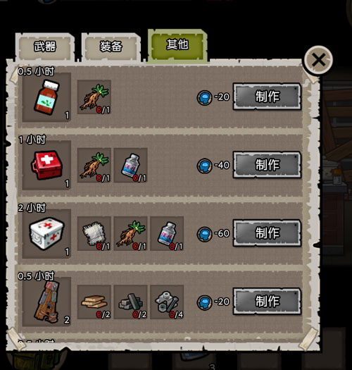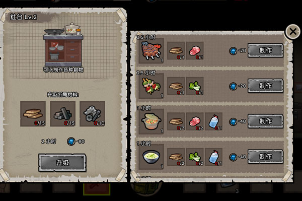 3、点击僵尸就能自动攻击,玩家在前期只能靠木棍、小刀等破烂来杀敌,随着工作台的升级,他能制作出越来越强大的枪械,装备手榴弹、燃烧瓶等辅助武器,饮食方面,则要用到灶台来制作食物。