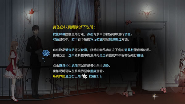 1、进入游戏,阅读以下说明,包括控制角色、使用道具以及地图;
