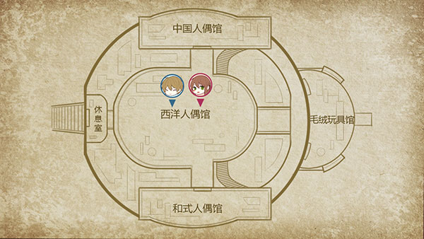 2、进入道具栏,点开地图,其上标有休息室、西洋人偶馆、和式人偶馆、中国人偶馆以及毛绒玩具馆。