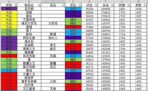 大家都知道,速度的快慢最直观的体现就在于出手的先后顺序,速度快的一方会优先出手。当大家的主力英雄,比如风王、瓦妹、暗主都达到十星时,谁的速度更快,谁通常就能占据极大的优势。接下来贴出这个游戏中大部分英雄的基础十星速度(图片源自官方群某大佬整理)