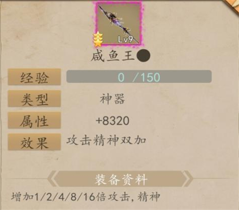 2、武器选用咸鱼王,满级以后只要你智力非常高,加成的精神是非常可怕的,最高8倍。衣服的话,有条件可以选用咸鱼王甲,同样可以加成八倍精神,并和咸鱼王武器叠加,即16倍精神。