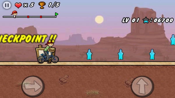在加速时需留意,自行车依靠脚蹬助力,加速得连续点击才行。这对跨越一些间距较大的障碍颇为有用。另外,游戏在不同节点设有存档点,路过便会自动存档。但挑战机会有限,务必把握好!