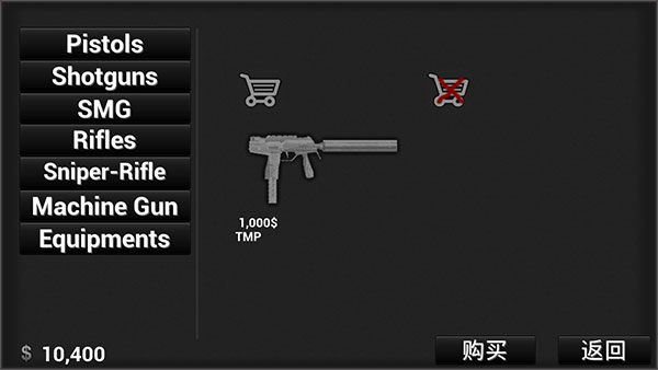 2、进入游戏后,即可获得你所设置数额的游戏金币。接着点击商店,进入商店后,能看到多种不同的枪支武器,如手雷、烟雾弹、机枪、霰弹(此处推测“散光弹”为“霰弹”误写)等,这些都能进行购买。