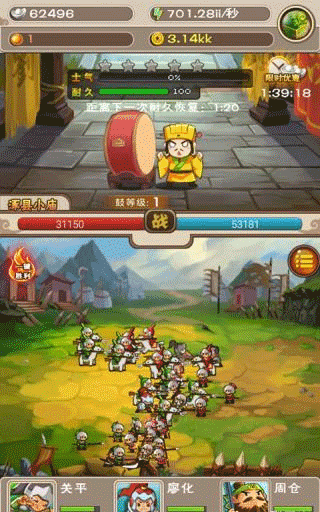战斗模式:在该游戏里,我们能够自主调整出战的武将。像小编一般会布置这样的阵容:让骑兵冲锋在前,弓兵在后方策应,步兵则负责保护骑兵。此外,战斗界面的上方设有敌我双方生命值对比图以及剩余士兵数量的统计。要是察觉到局势不利,难以取胜,不妨运用三十六计中的“走为上计”,点击界面右上方的撤退按钮即可。