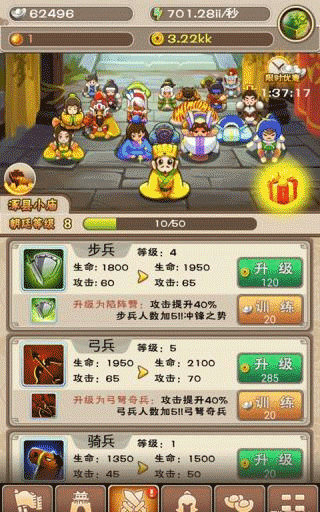 兵种升级:于兵营界面,我们能够对兵种进行升级。兵种作为作战的核心力量,三大兵种各具特色:骑兵在突进方面表现出色,瞬间击败弓兵与武将主要依靠它;步兵属性较为均衡,既能提供稳定的输出(DPS),也是相当不错的肉盾;弓兵则具备远程输出能力。就小编目前所掌握的信息,主要存在两种升级方式:其一,优先着重升级骑兵,当资金不足以继续升级骑兵时,再去升级步兵和弓兵。此升级方式可实现快速消灭敌方士兵与将领,即所谓的“秒兵秒将”;其二,采取平衡升级策略,使三种兵种都拥有一定的作战实力。