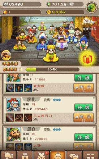 二:适合玩家类型:时间不充裕的玩家,升级大臣。大臣们会自动磕头赚钱。随着解锁的大臣越来越多,赚钱的速度也越来越快。而且即使你退出了游戏,大臣们也会默默的磕头赚钱,不需要你经常关注他们,可谓幕后英雄。
