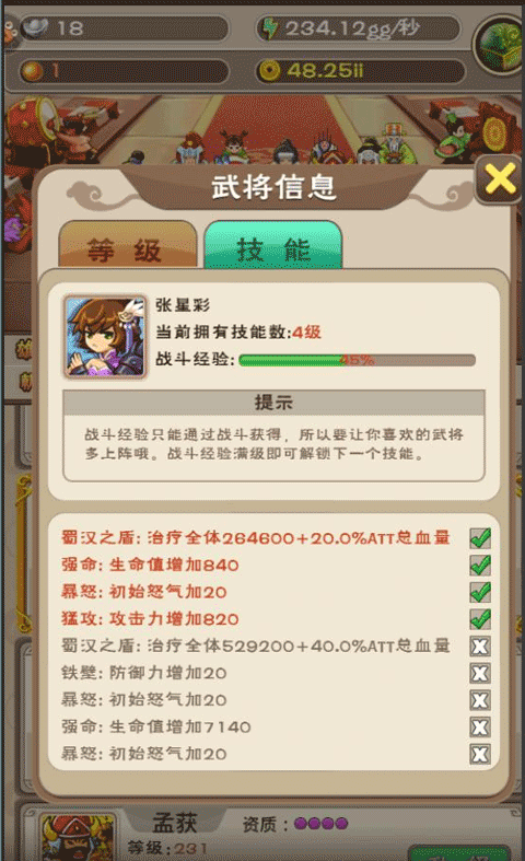 武将系统:于武将界面能够提升武将等级。其一,相较于兵种,武将具备攻击力高这一显著优势。与此同时,战斗过程中小兵不太倾向于攻击武将,故而提升武将等级可迅速提高DPS。其二,每一个新解锁的武将初始等级都颇高。所以玩家们需尽快完成一个州的攻占。此外,游戏里设有武将计的设定,每个武将皆拥有各自专属的武将计,不过目前该武将计仅能通过花钱购买。