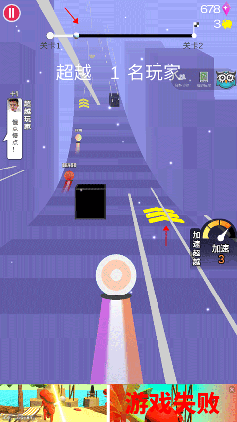 5、你仅需操控球球,避免撞上黑色障碍物。在持续滑行的过程中,速度会逐渐加快,当上方的进度条抵达关卡2,就意味着你已成功通过第一关。