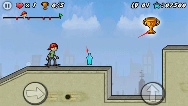 滑板少年这款手游充满趣味,属于冒险闯关类型。其玩法轻松有趣,玩家操控一名滑板少年,借助加速、跳跃等动作,在空中做出各式各样的姿态,同时收集关卡里的金币与奖杯,最终抵达终点就算通关。