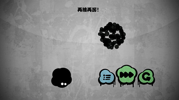 《永不言弃》的游戏画面风格,以极具创意的另类墨汁效果塑造而成。整体色彩虽偏向灰暗,却不乏明亮之感,这是由于游戏中大量采用了对比极为强烈的色彩来相互搭配。另外,游戏主角是一个仅有两只眼睛的黑乎乎小球,它没有手和脚,然而游戏公司竭尽全力为它设计了丰富多样的肢体语言与动作,目的是为玩家营造出一种动感十足的游戏体验。