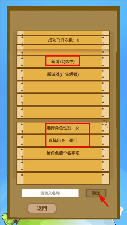 2、当玩家进入游戏页面后,点击“新游戏”选项,接着依次选择性别、出身,输入角色名字,最后点击“确定”按钮。