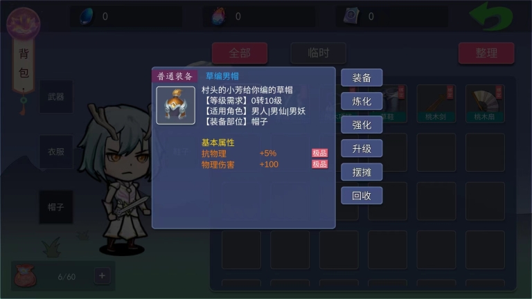 9、点击对应的装备,就能查看详细的属性介绍,同时还能执行装备、炼化、强化、升级、摆摊以及回收等操作。