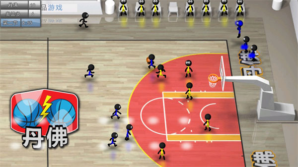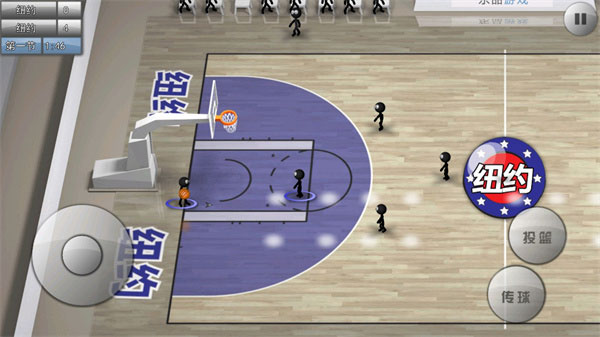 3、在赛事里,通过虚拟摇杆能灵活操控火柴人进行跑位。两个按键的功能会依据攻防转换,实现传球、投篮、切换、抢断、篮板等操作,使玩家凭借简单操作就能掌控多种动作,轻松体验比赛的乐趣。