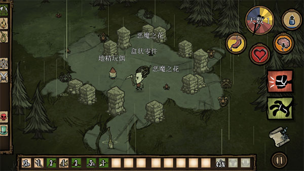 8、这款游戏最具特色之处在于其天气状态,同时游戏设有饥饿、昼夜交替等设定。玩家不仅能够生火,还能搭建庇护所。尤其在黑夜,务必点燃火把,否则血条会持续下降,要努力坚持活下去。