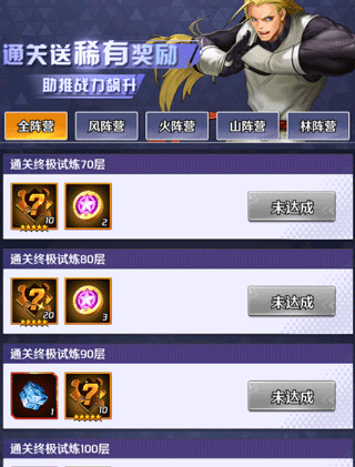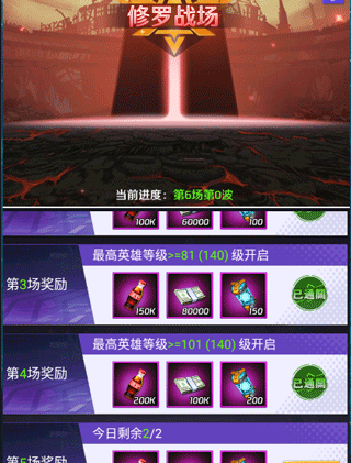 一次性闯关活动,跟主线类似,没太多可说的,一个字莽就对了!奖励包括大量钻石、五星碎片、街机币、英雄装备等等,每次战力提升都可以来多闯几关!