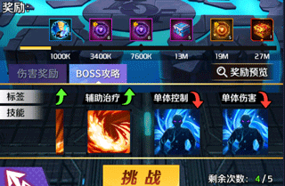 这主要是获取英雄装备以及装备升级材料的,总共有风、火、山、林四种类型的BOSS。不同类型的BOSS会掉落相应部位的装备。打法方面没什么特别要讲的,就是在尽可能短的时间内战胜BOSS。稍微需要留意两点: