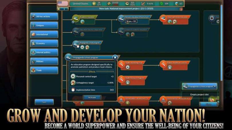 2、在全球排名图表中,将你国家的经济实力、科技竞争力以及军事霸权发展壮大至最高级别。无论是成为联合国的重要一员,还是充当核暴君欺压周边,皆由你抉择。