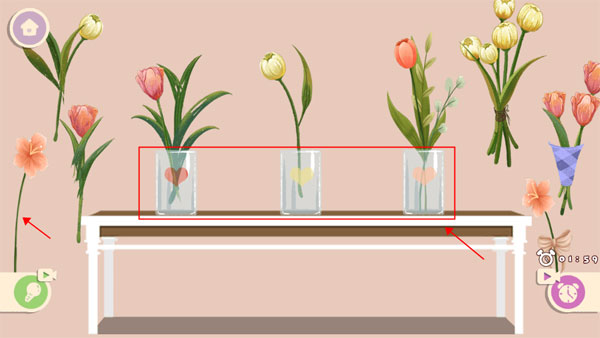 这一关卡的规则是,依据瓶子上爱心的颜色,将花插入对应的位置。具体来说,把浅粉色的花放进最右边的瓶子,黄色的花放在中间的瓶子,深粉色的花则置于最左边的瓶子。当所有花按照要求放置完毕,就意味着收纳成功。