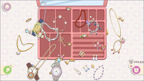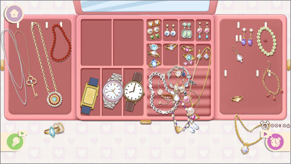 首饰盒里收纳着耳坠、项链、手表等物品,需依据其各自不同的大小与形状,放置到对应的指定位置。