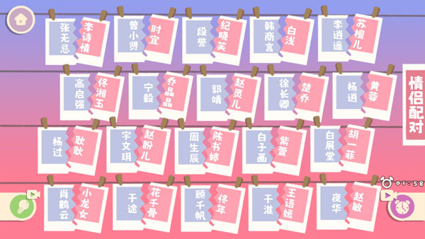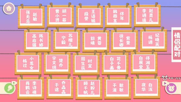 此关卡的玩法是把大家耳熟能详的情侣组合进行配对,像郭靖与黄蓉、杨过跟小龙女之类,当所有情侣都成功配对便能顺利通关。