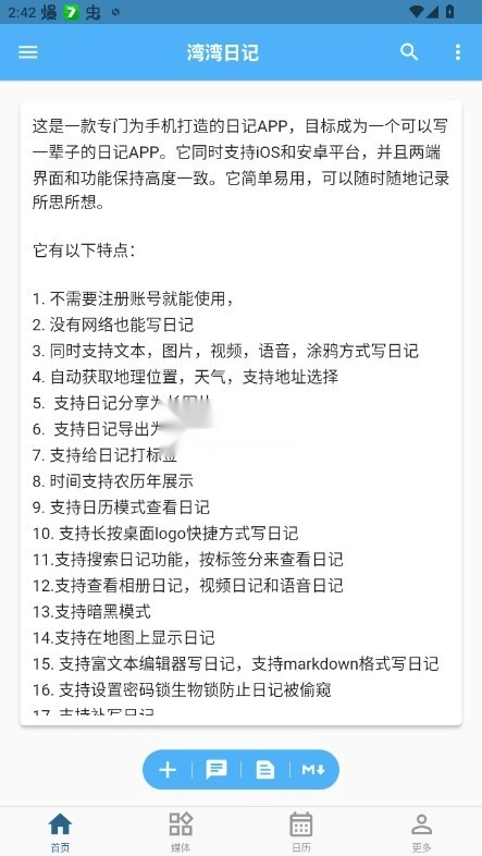 湾湾日记是一款可以使用一辈子的日记。它私密、安全、永不丢失数据。它可以自动记录时间、地点、天气和标签,并可以用文字、视频、图片、语音记录一切。