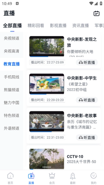提供直播节目预约、回看功能,支持一键投屏、倍速播放、音频播放。