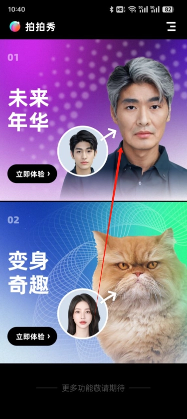 拍拍秀,堪称创意拍照的神奇利器,能带你体验奇妙的影像变幻。它具备“未来年华”与“变身奇趣”两大特色功能。快来加入拍拍秀,开启奇幻的拍照旅程,去探寻与众不同的自己吧!