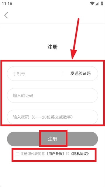 请依次输入手机号、验证码以及密码,勾选“注册即代表同意《用户条款》和《隐私协议》”,随后点击“注册”按钮即可完成注册操作。