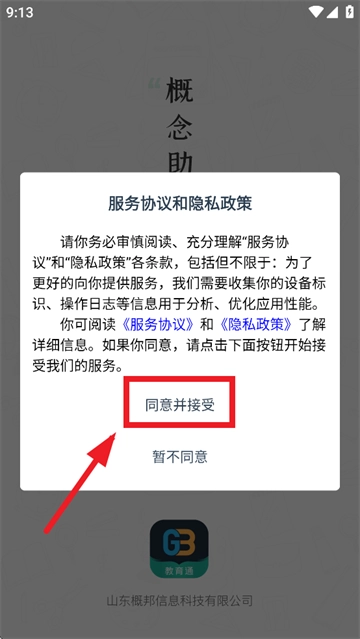 在本站安装并打开家校教育通,先同意并继续服务协议和隐私政策