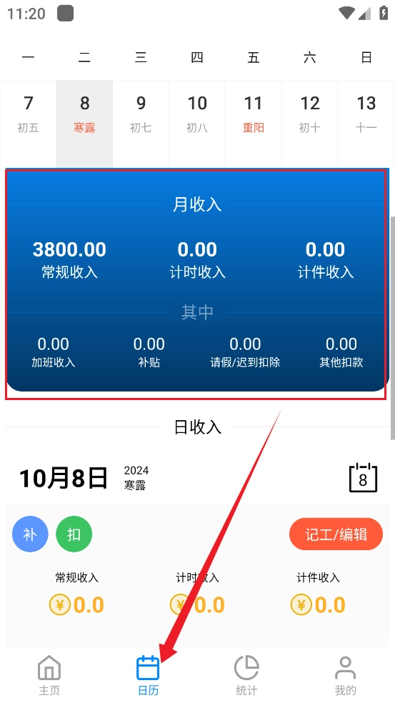 4、进入到【日历】界面,用户可以查询到当月的常规收入等各项数据信息,