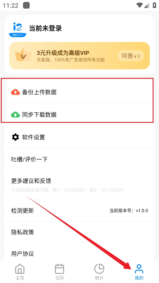 6、当然软件是支持数据备份和上传的。进入到【我的】界面,点击如图所示按钮即可。