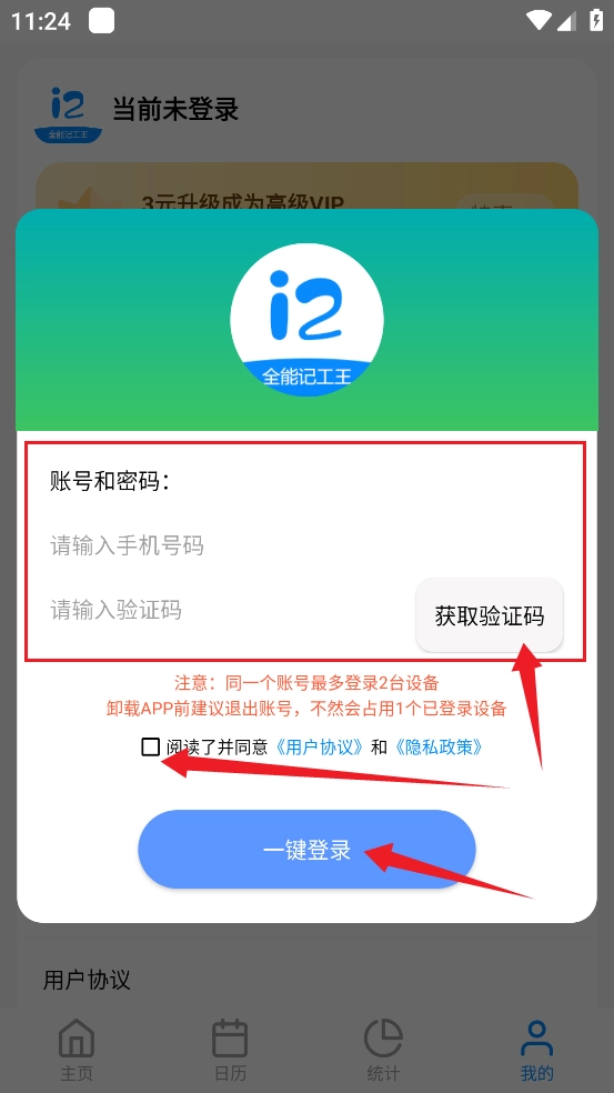 7、因为是首次使用,想要体验完整功能和服务,需要登录账号,如图所示,输入手机号码,获取验证码,点击一键登录即可。