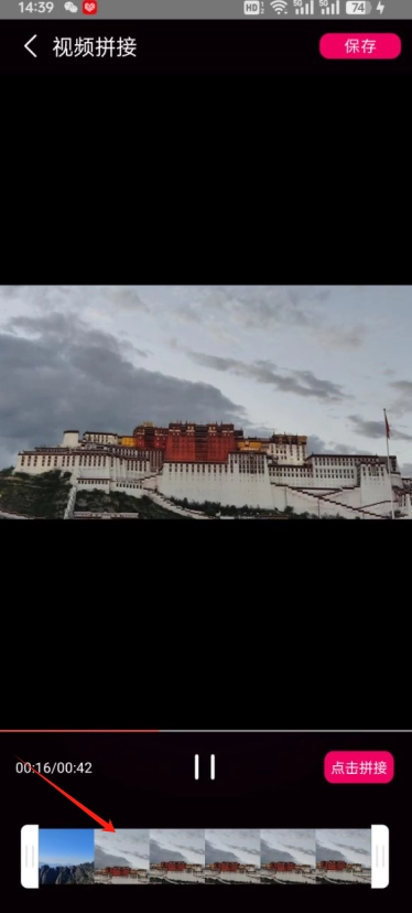 2、然后点击视频拼接,进去先选择第一个视频,然后继续点击视频拼接
