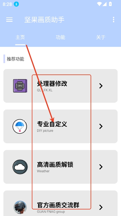 1、进入主页,可以查看处理器,专业自定义,高清画质解锁等功能