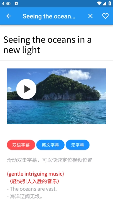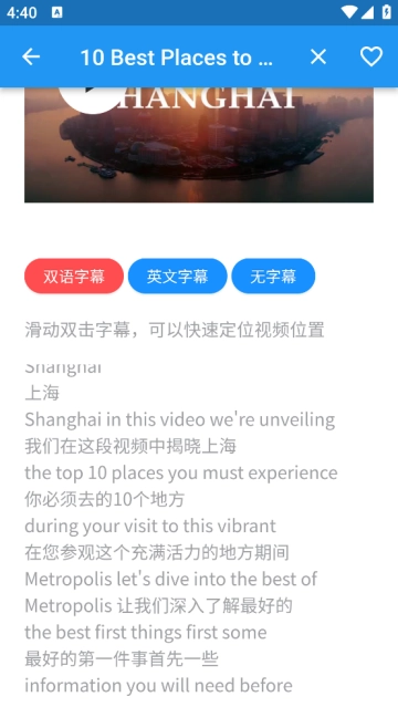 -提供双语字幕、纯英语字幕、无字幕三种模式切换,让您在真实语境中高效学习外语!