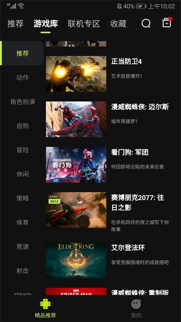 2、在游戏库中,分为动作、角色扮演、自购、冒险、休闲、策略、体育、竞速等丰富的游戏类型,玩家可根据喜好自行选择体验,这里以【正当防卫4】为例;