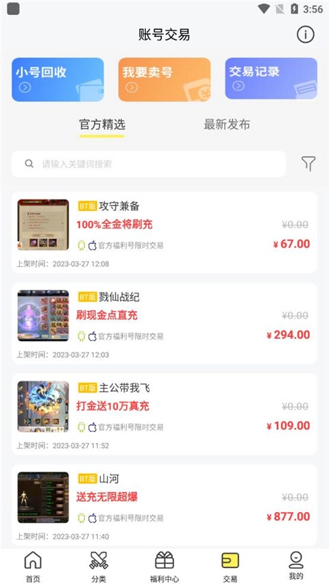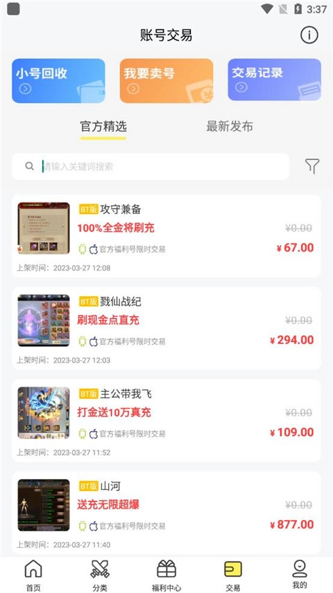 5、点击交易专区,还支持在此卖号、回收、记录交易等操作。