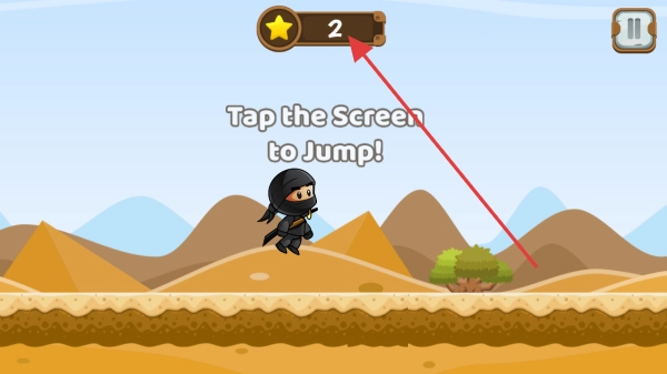 2、进入第2关后,依据提示【Tap the Screen to Jump!】,点击屏幕操控忍者跳跃,跨越沙漠地形中的沟壑、小坡等障碍,注意上方星星。