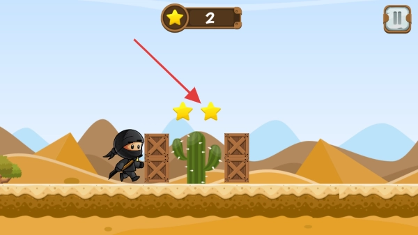 3、遇到仙人掌、木箱等障碍,把握时机点击屏幕让忍者跳跃,收集空中星星,同时避开危险,顺利通过关卡,解锁后续冒险内容。