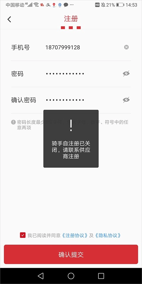 2、但是当用户填写好信息提交后会提示骑手自己不能自己注册,需要联系供应商