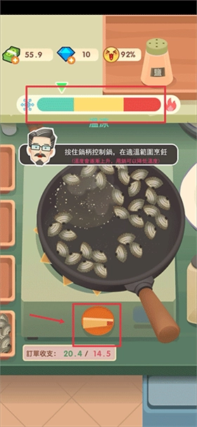 6、按住并拖动锅柄开始烹饪,同样是需要在适合的温度范围内烹饪,当温度过高时,甩锅可以降低温度。