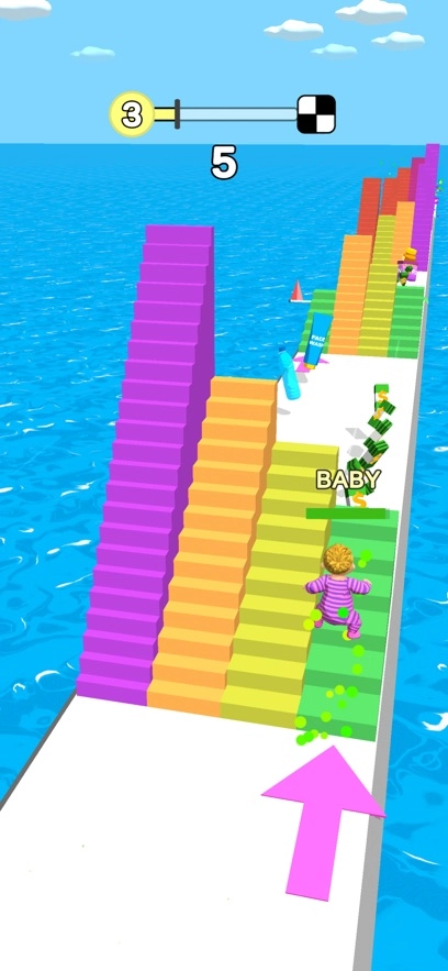 1、关卡开始后,角色自动奔跑,玩家通过左右滑动躲避底部堆叠的“岁月催化剂”,避免年龄快速增长导致挑战失败。