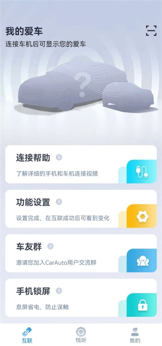 2、连接车辆:使用数据线将手机与车机连接,打开中控的智慧互联功能,在App内点击“互联”即可完成连接。