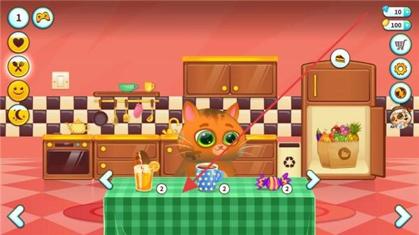 2、厨房点冰箱!选水果篮喂猫,喂完点杯子互动,触发喝水动作,每小时做1次,健康值+30,看到圣诞主题弹窗。