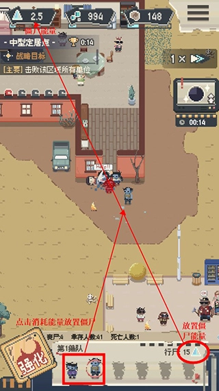 玩家可以点击下方强化图标,使用蓝色能量,强化僵尸,提高它们的伤害、生命值、移动速度。