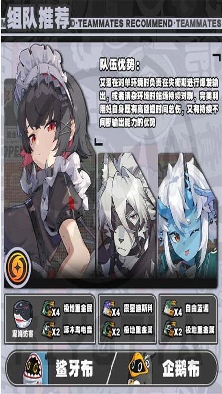 五、队伍搭配纯冰队:艾莲+狼哥+苍角。这是一个主打冰弱点敌人的队伍,可以充分发挥艾莲乔的冰属性输出能力。通用性队伍:艾莲+女仆+苍角。这是一个开荒常用的通用性队伍,可以应对多种敌人。开荒队伍:艾莲+安比+苍角。这是一个适合新手的开荒队伍,后两个角色都是免费获得的,容易组建。