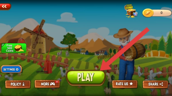1、实体信息中包含【PLAY】(开始游戏)按钮,以及FreeCoins(免费金币)、SETTINGS(设置)等功能项,界面呈现出田园农场场景,此界面属于模拟经营农场的启动界面。